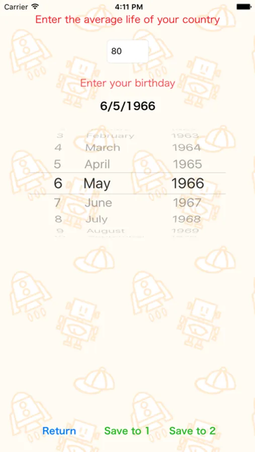 The other, it works out in ”What day from birth”, ”What days until the average life”,” How many days until the sixtieth birthday”, “How many days until the next birthday”. Please think carefully look at these numbers.