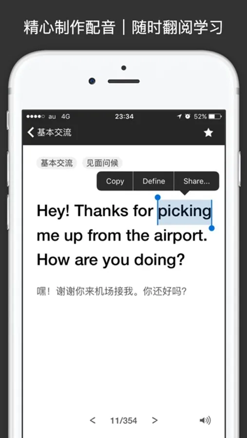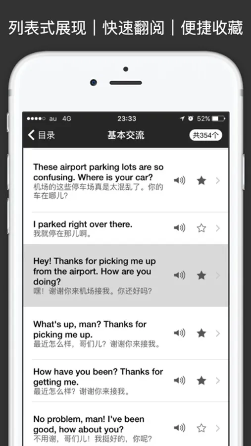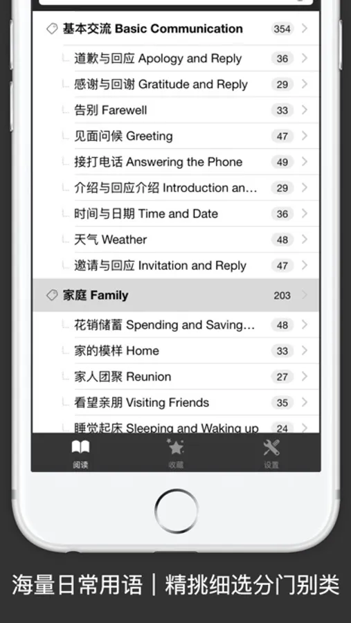 每条语句皆提供中文解释|所属分类,配合系统字典,可长按查阅生词