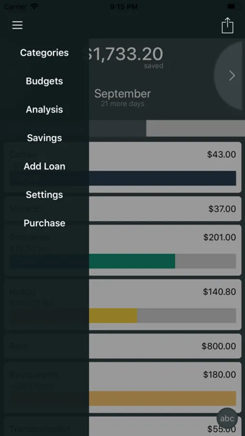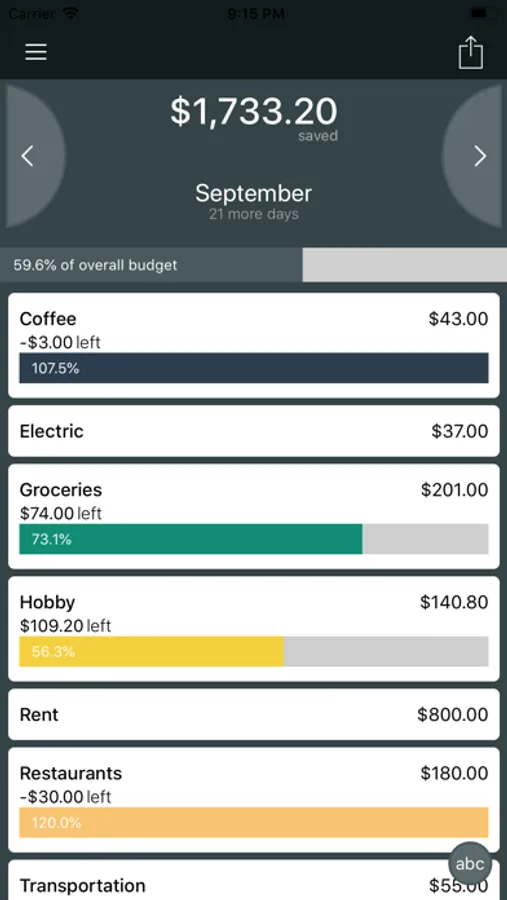 A simple and free tool to keep track of your savings every month. Quickly add an expense by selecting a category on the home screen and entering an amount.