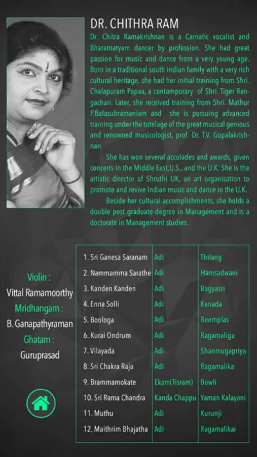 Dr. Chitra Ramakrishnan is a Carnatic vocalist and Bharatnatyam dancer by profession . She had great passion for music and dance from a very young age. Born in a traditional south indian family with a very rich cultural heritage, she had her initial training from Shri. Chalapuram Pappa, a contemporary of Shri. Tiger Rangachari. Later, she received training from Shri. Mathur P.Balasubramanian and she is pursuing advanced training under the tutelage of the great musical genius and renowned musicologist, prof. Dr.T.V.Gopalakrishnan.