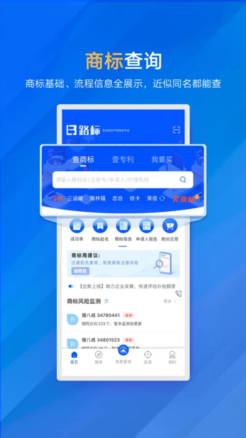 【商标监测】您可以监测商标,监测后您可以在app内接收到商标动态更新和风险的提醒,帮助您做好防御商标策略。