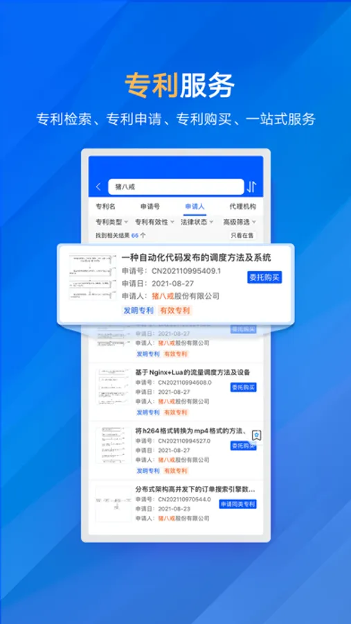 商标进度查询是八戒知识产权打造的一款综合商标查询、交易服务平台,致力为用户解决商标、专利申请提交后,获悉相关信息难的问题,并帮助企业闲置资产快速变现。集成商标起名,商标分析报告等特色功能帮助用户更好查询。
