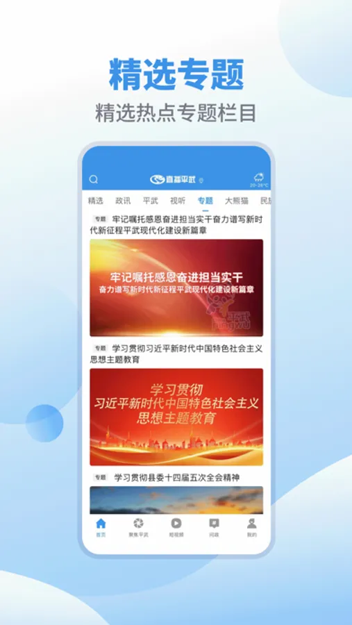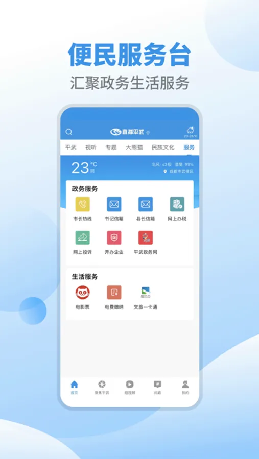 《直播平武》APP是平武县融媒体中心(平武县广播电视台)官方手机客户端,是一款以提供平武本地新闻图文直播、电视直播、广播直播、路况直播和国际国内重大新闻、便民生活等全方位的城市生活应用的移动客户端产品。目前,包含资讯、直播、视讯、专题、政务、报料、短视频、服务、部门乡镇等板块。荟萃平武县融媒体中心及各大媒体的精品内容,进行各类突发事件的权威应急发布,通过个性化的精准推荐为广大市民提供全面城市生活资讯服务,成为平武千万市民“一手掌握平武”的公共服务传播平台。