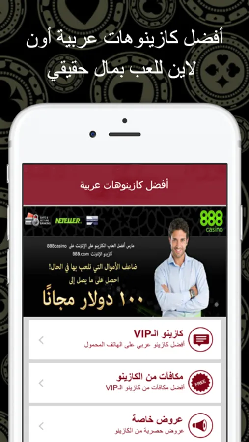 هل تبحث عن مكافآت VIP ترحيبية؟ أفضل كازينوهات عربية أون لاين للعب بمال تقدّم عروض حصرية للمكافآت واللعب المجاني في أكبر وأفضل الكازينوهات في العالم مثل كازينو 888 والكثير من الكازينوهات...