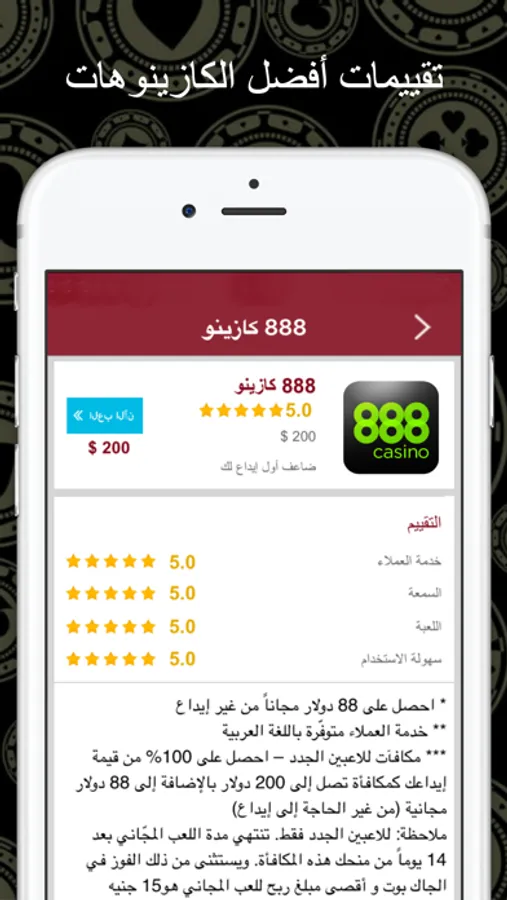 محتاج خبير ليرشدك إلى أفضل كازينو؟ اقرأ تقييمنا للكازينو الذي يضم معلومات عن السمعة والتغطية للألعاب وسهولة الاستخدام وخدمة العملاء وطرق الإيداع والسحب ووقت استلام المال.