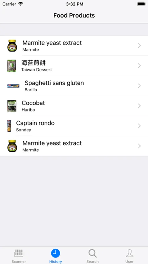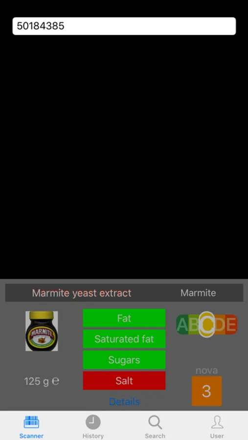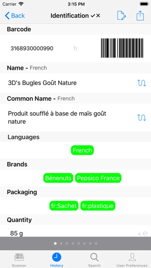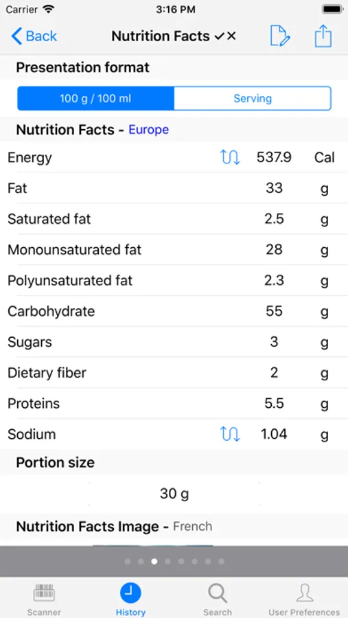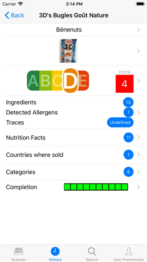 The app keeps a history of your searches, so you can always go back to see what you have done. This history has a maximum size of 100 searches and can be deleted if necessary. For each product a main image and a product summary is shown. The summary also comprises a colour coded appreciation of the product, with specific colour codes for fat, saturated fat, sugar and salt content.