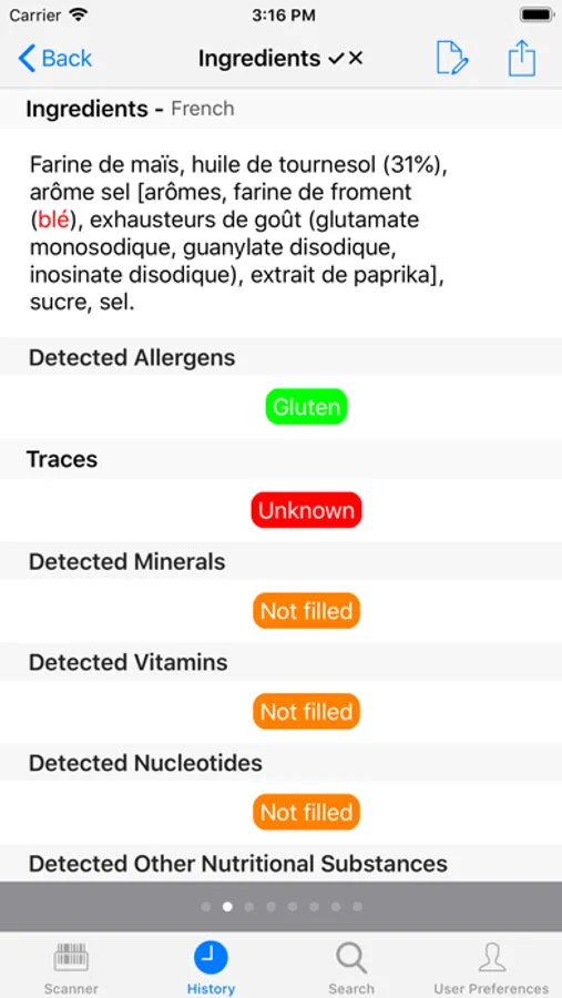 Food Viewer helps you to read the labels on food packages. After scanning the barcode (or entering it by hand), the app will retrieve the information on the label on Internet. This information is presented in six sections: