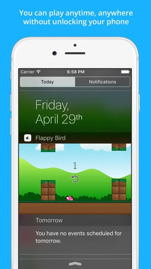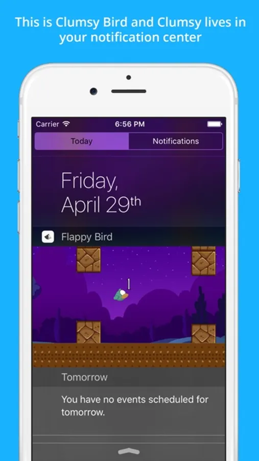 • Play with Clumsy anytime, anywhere, by just dragging down from the top on your screen to reveal the notification center and your Clumsy Bird will be there waiting for you!