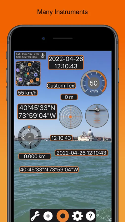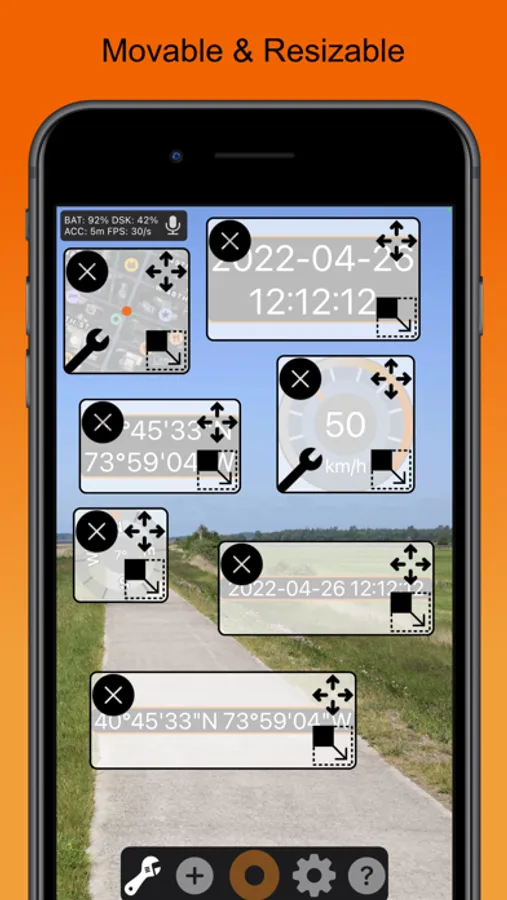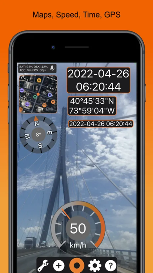 Timestamp Video Camera renders instrument displays for map, speed, GPS location, altitude, g-force, compass, time, date, timestamp and many more directly into your action video movie at the time it is recorded with your built-in camera. Timestamp Video Camera turns your device into the ultimate action camera. It does not only display these instrument on screen, but it renders them into the MPEG-4 video. These 'head up display' instruments are configurable and freely movable and scalable within the video frame.