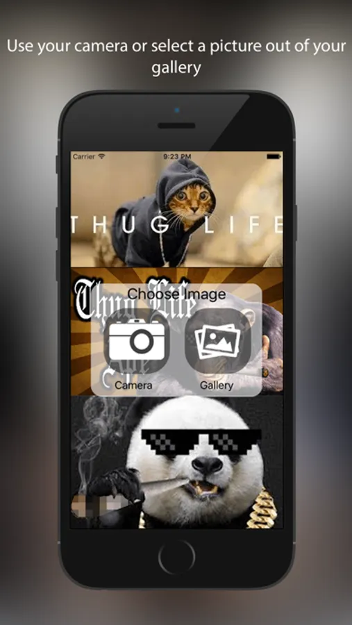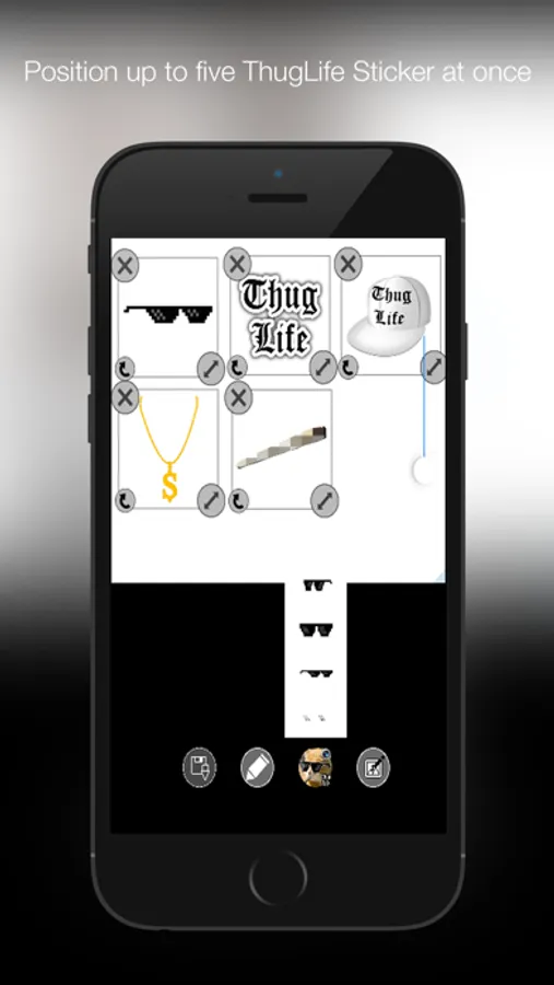Easy choose a picture from gallery or take one by yourself. Hit the ThugLife Button in the right corner to add stickers. Drag them to the right position and resize or rotate it. Save and share with your friends via all messengers.