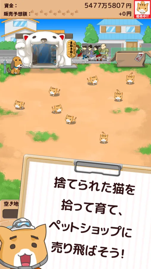 ダンボールから、どんどん出てくる捨てねこを触ってエサをあげて成長させてペットショップに向かわせ、ねこ好きの人間の軍団をタップして販売しよう!