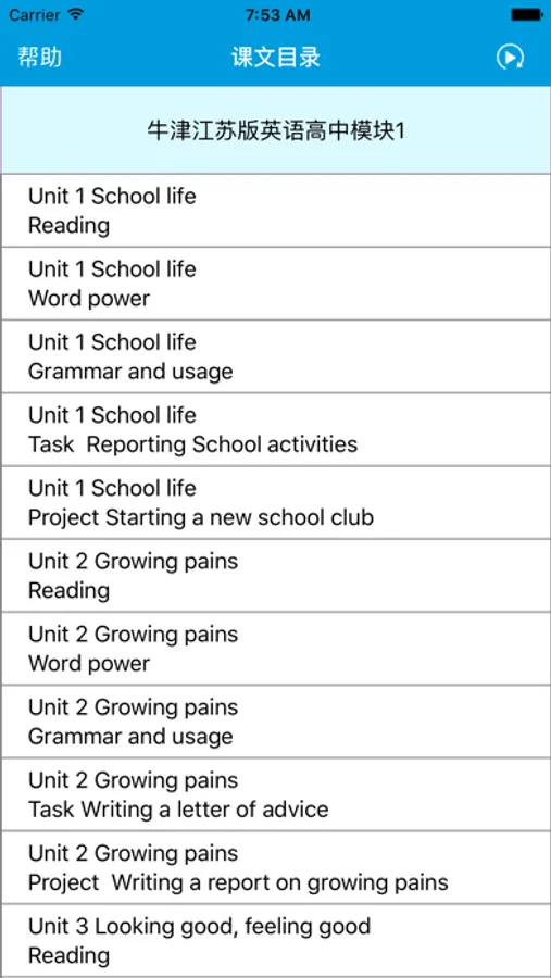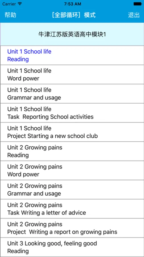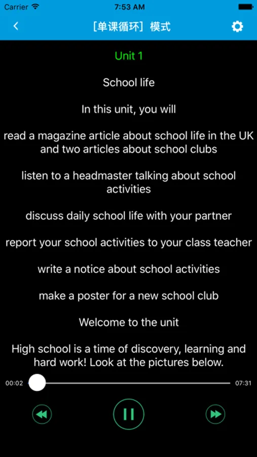 本应用对应牛津江苏译林版英语高中模块1课本,具有跟读模仿,自动听写,变速播放的复读机功能。