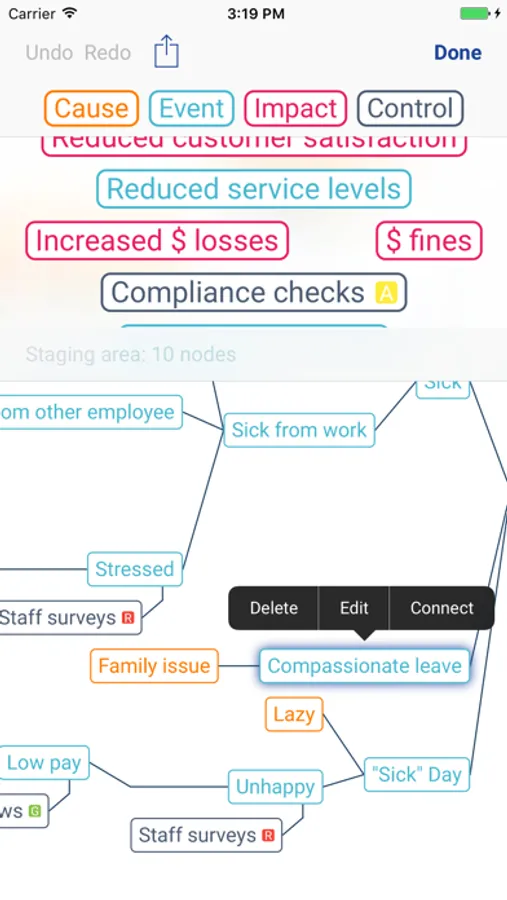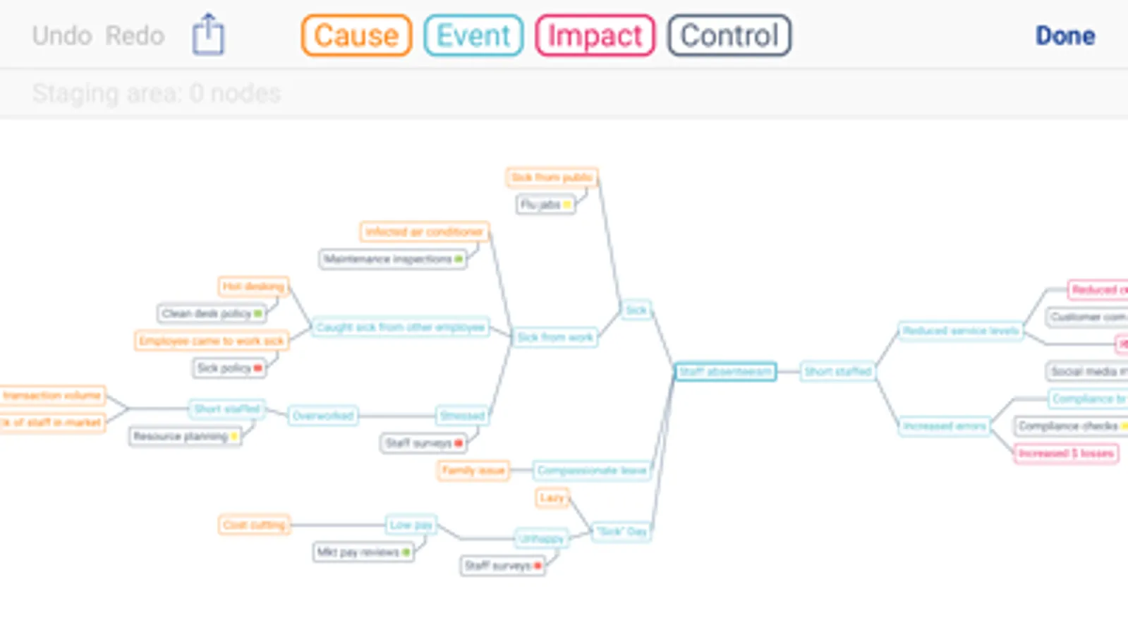Protecht.BowTie allows you to quickly drag risk events, causes, controls and impacts into a staging area or onto the bowtie working area. Our algorithm will automatically position the nodes in the shape of the bow tie – cause nodes to the left of the risk event, impact nodes to the right. Controls to mitigate likelihood or impact can be linked to these nodes.