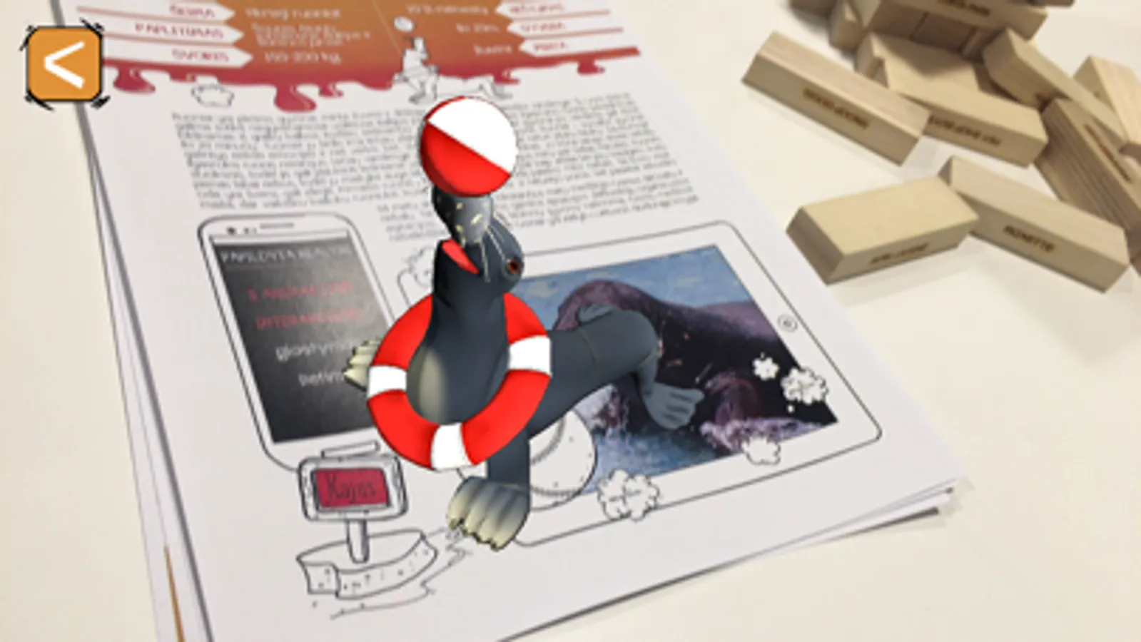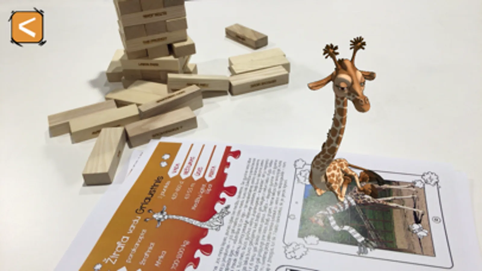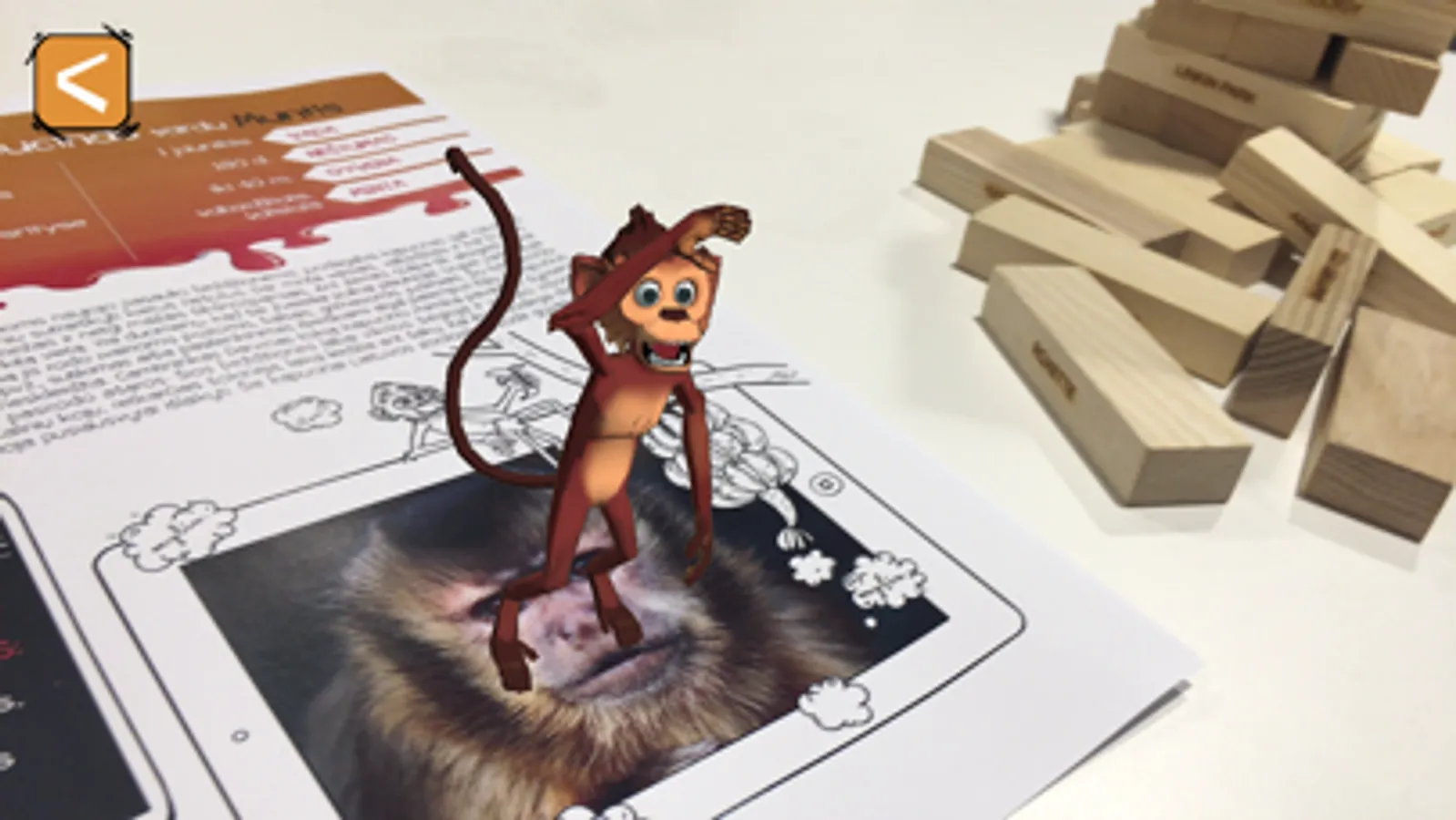 - Įjungus programėlę ir nukreipus mobilųjį įrenginį į knygos dešinėje prie gyvūno aprašymo esančią jo vardo lentelę, knygos puslapiuose atgis 4D personažai.