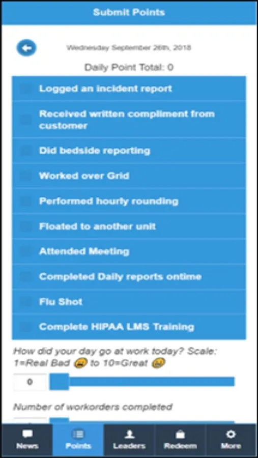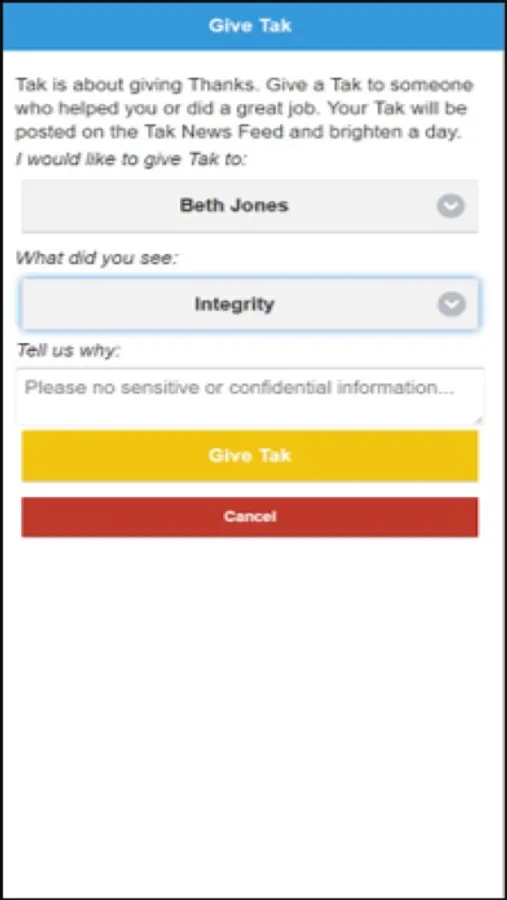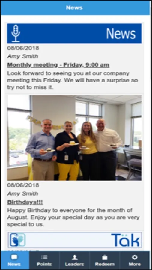 The Tak Points App is a unique incentive program to improve engagement of Registered Nurses (RNs) working in a hospital environment. RNs perform countless thankless tasks which often leads to high nurse turnover. Tak awards points and provides a communication channel for managers to say 'Thank You' to nurses and show appreciation. Registered Nurses can redeem the points earned doing everyday tasks for rewards, prizes and vacation. The Tak program builds RN engagement which improves RN retention and retaining nurses improves patient care and hospital performance.