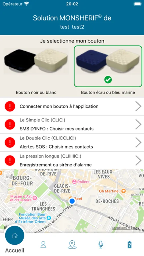 MONSHERIF© est un tout petit bouton porté sur soi de façon non visible connecté à l’application du même nom téléchargée dans votre smartphone. Il permet d'agir en toutes circonstances par différentes pressions via l'application.