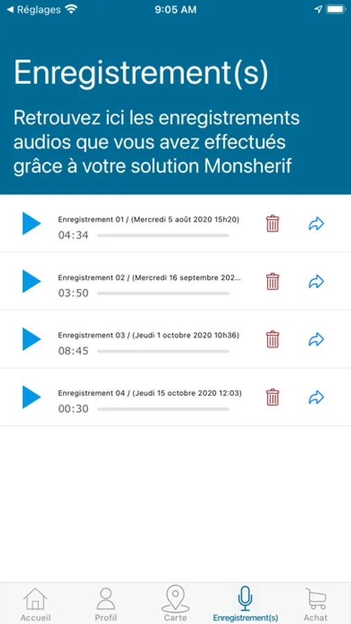 MONSHERIF© permet l'envoi géolocalisé et simultané jusqu'à 5 contacts d'un sms d'information ou d'une triple alerte - sms, email, appel téléphonique - pour mobiliser les secours. Il permet aussi de déclencher une alarme sonore ou un enregistrement sonore aux fins de restitution de preuves. L’appli offre la possibilité de déposer les enregistrements dans un serveur externalisé à l'accès sécurisé en cas de perte ou de vol de votre téléphone.
