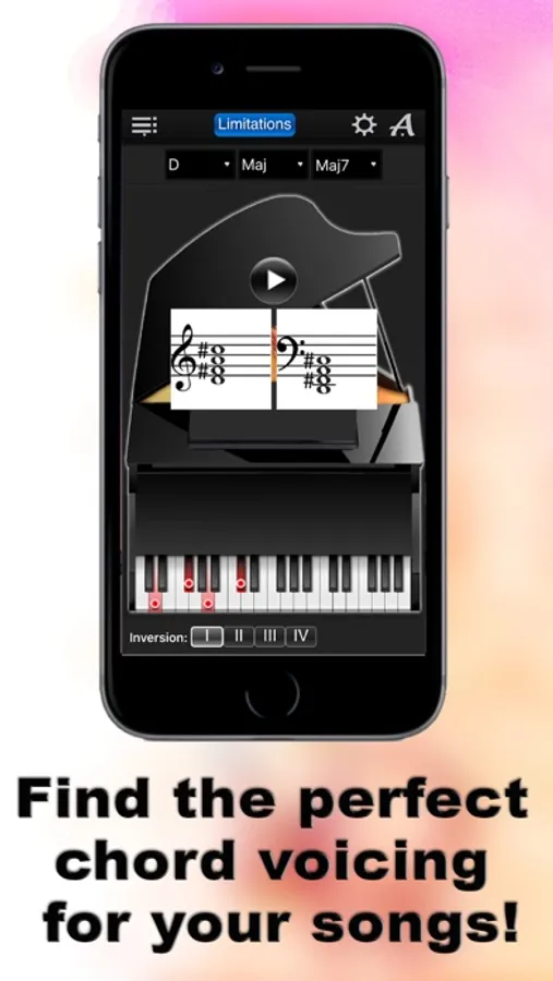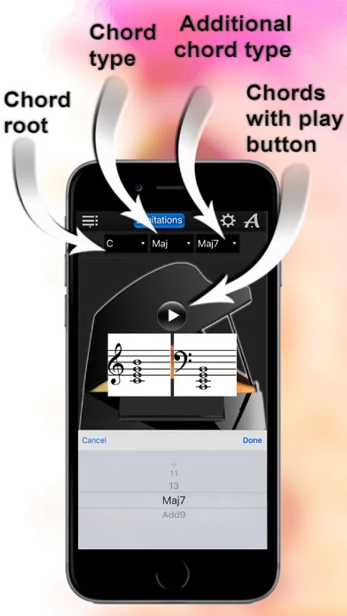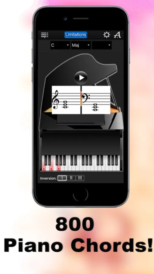 Thanks to a specially developed algorithm, the app can show you more than 800 chords. Simply select a chord root on the left, chord type in the middle, the chord type addition on the right, and explore the chords with “Piano Chords Compass Lite”!