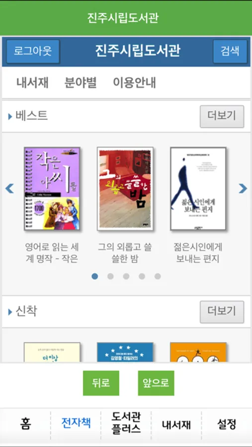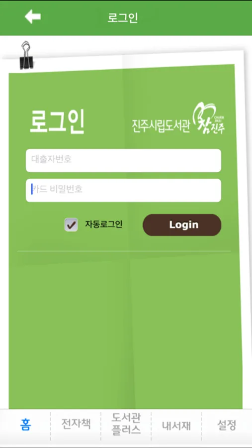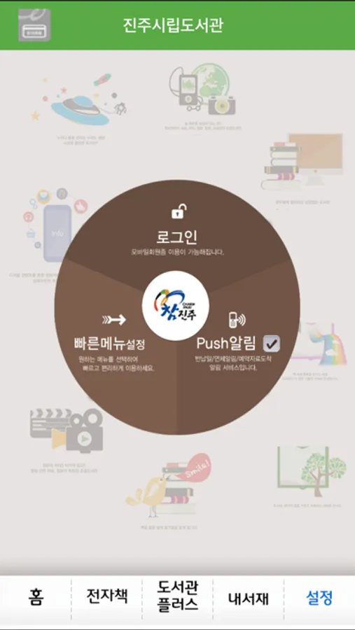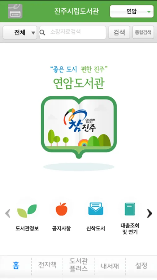 진주시립도서관의 도서검색, 모바일회원증, 도서관 안내, 전자책, 대출조회 및 연기 등의 기능을 이용할 수 있습니다.