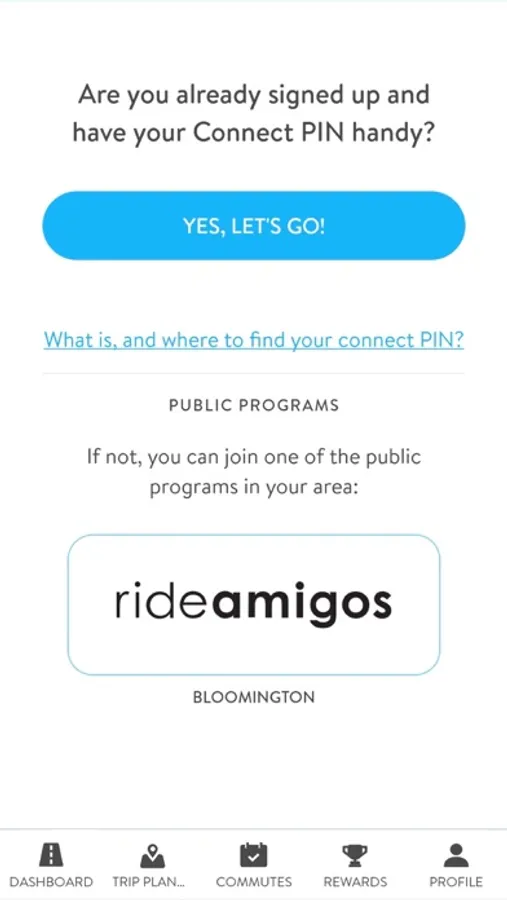 Note: To use this app, you’ll need a free Connect PIN from a participating commuter program powered by RideAmigos. If you are not sure how to get a Connect PIN, contact RideAmigos to find out if there is a commuter program in your area: appsupport@rideamigos.com”