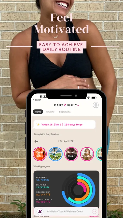 Bella is Baby2Body’s AI wellness coach, trained on Baby2Body’s database of science-backed lifestyle guidance and research compiled by our team of women’s health experts. Bella is designed to be your go-to personalised wellness coach for pregnancy. You can ask her anything and she’ll tailor her guidance to your individual needs, stage, and preferences.