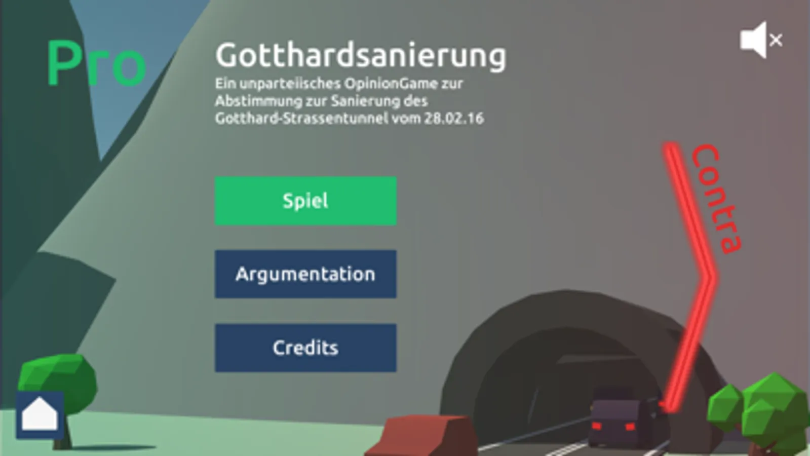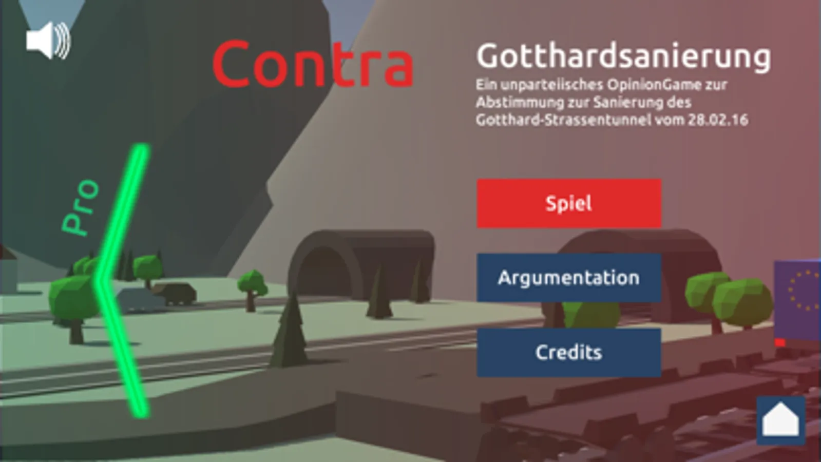 Spiele "Opiniongames: Gotthardsanierung" und erfahre kurz und bündig die grundlegenden Ideen, Konzepte und Argumentation hinter der Abstimmung zur Sanierung des Gotthardtunnels auf unterhaltsame, spielerische Art und Weise!