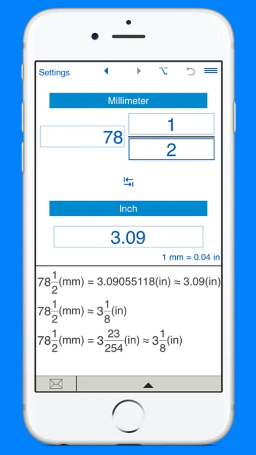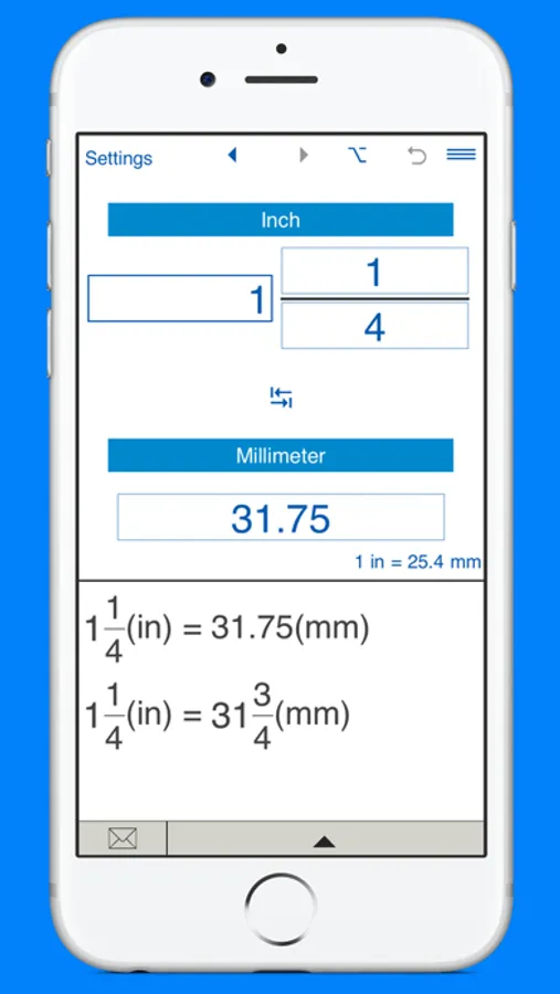 "Flip" button lets you easily switch between "Inches" and "Millimeters".