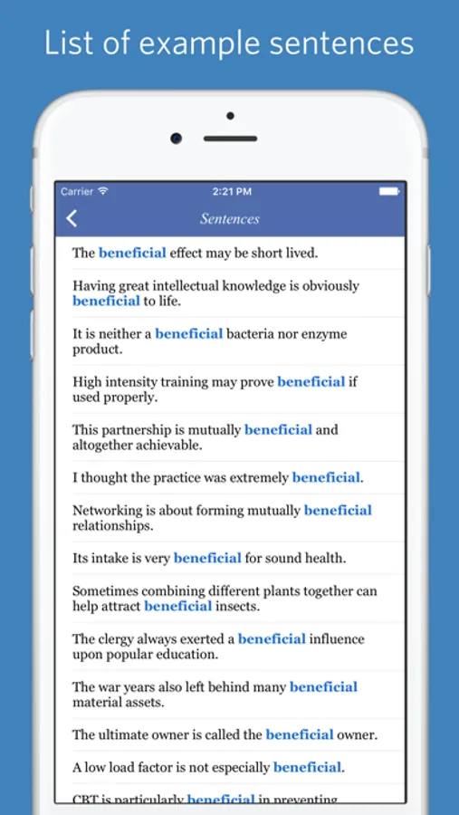 - It is more efficient to learn a word in its context. In addition to a sample sentence, the app provides a tool to look for sample usage from news. You will easily remember its meaning and know how to use it in sentence.