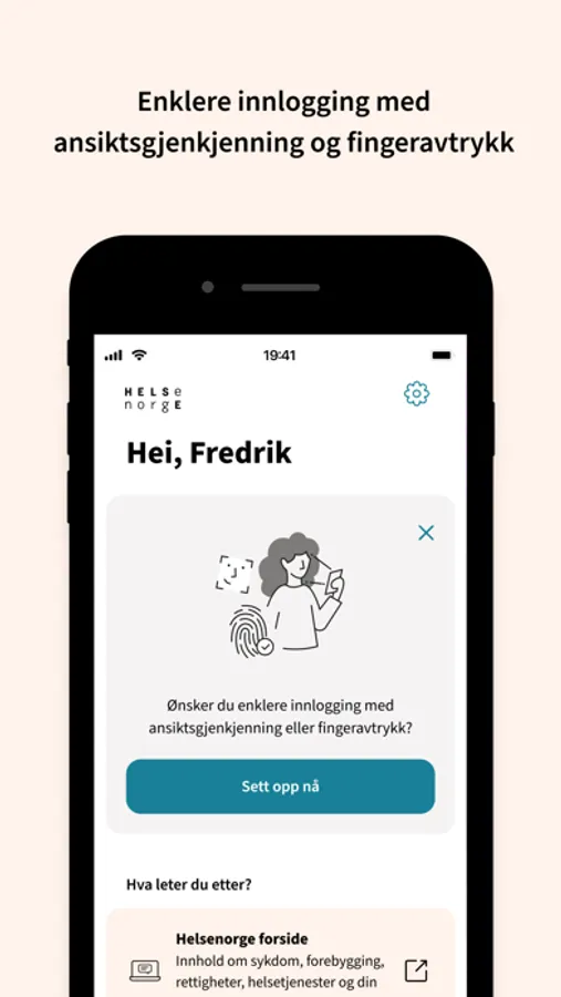 Nå er det enklere enn noen gang å logge seg inn på Helsenorge. Bruk personlig pinkode, ansiktsgjenkjenning eller fingeravtrykk. Da får du tilgang til nye meldinger og hendelser, og et mangfold av offentlige tjenester som hjelper deg å følge opp egen helse.
