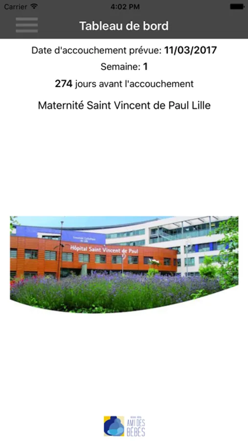 - un tableau de bord : date d’accouchement prévue, nombre de semaines écoulées, nombre de jours avant l’accouchement