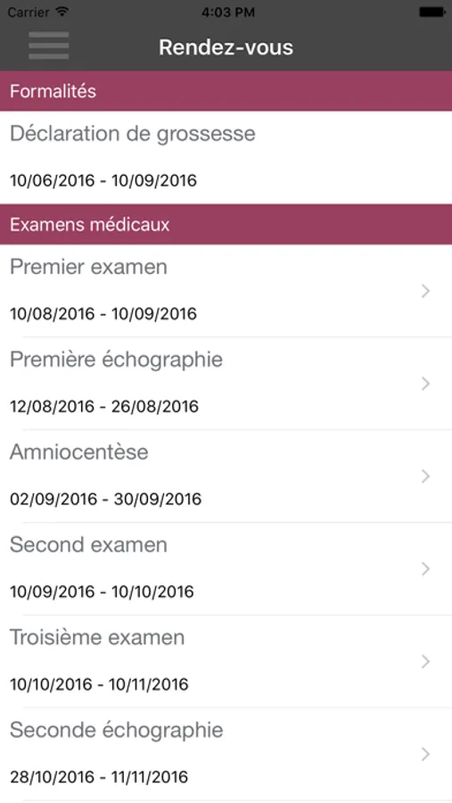 - un calendrier de grossesse : formalités à effectuer (déclaration grossesse …). Les rendez-vous à prendre pour les consultations , les examens, les écographies obligatoires. La gestion de ces rendez-vous : une liaison avec le calendrier du smartphone et une alerte pour ne pas oublier le rendez- vous.