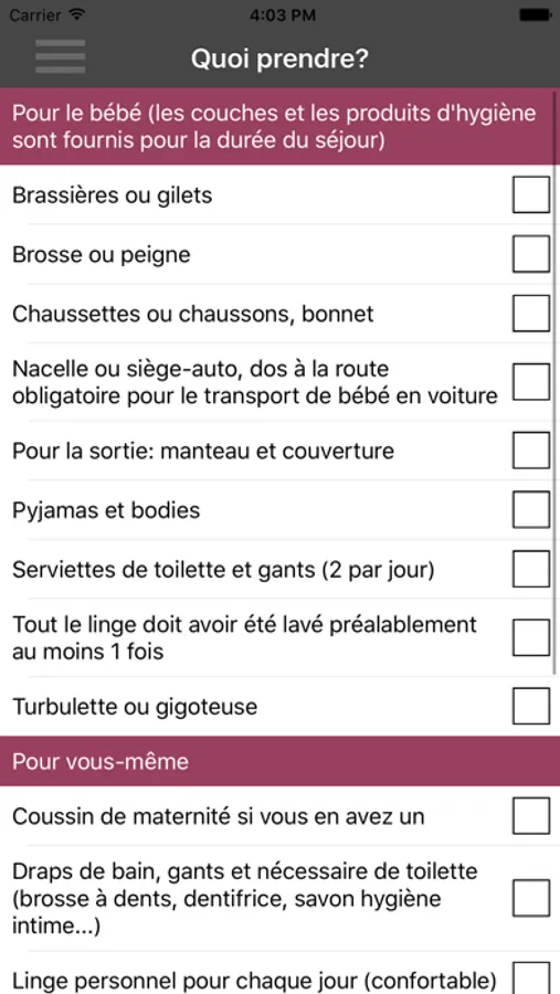 - des renseignements pratiques : congé maternité, composition de la valise de bébé, recommandations pour optimiser la grossesse.