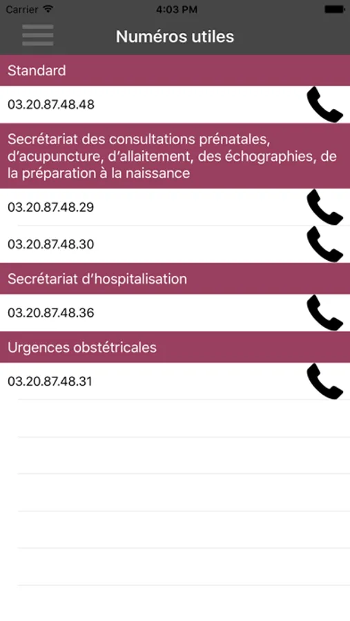 - une liste des numéros utiles de l’établissement (secrétariat maternité, médecins..) et des numéros à appeler en cas d’urgence.