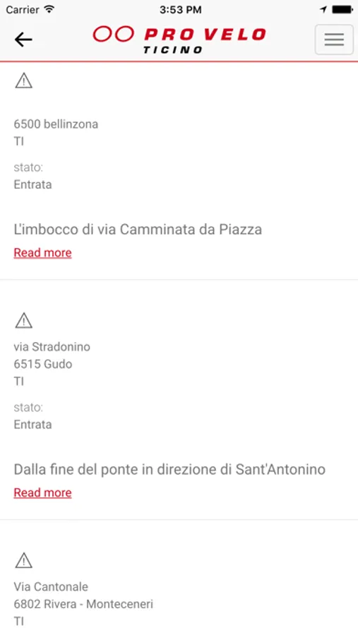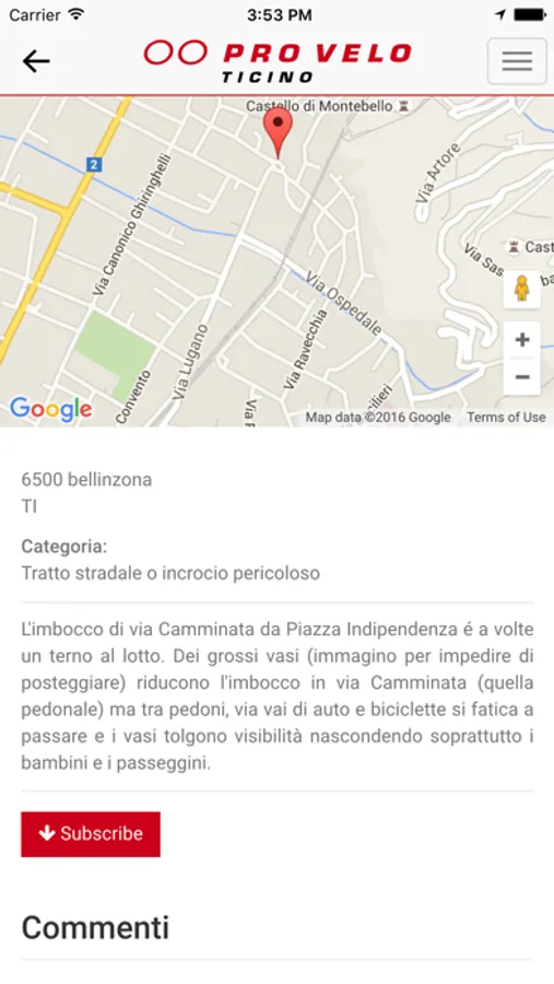 Questa App è gratuita ed offre la possibilità di segnalare i vari punti che giudicate problematici, critici o pericolosi. I punti da voi inseriti verranno integrati nella mappa online. Invitiamo tutti i ciclisti ticinesi a segnalare qualsiasi punto critico o pericoloso. I singoli punti segnalati vengono analizzati e segnalati alle autorità con le quali si procede a trovare delle soluzioni.