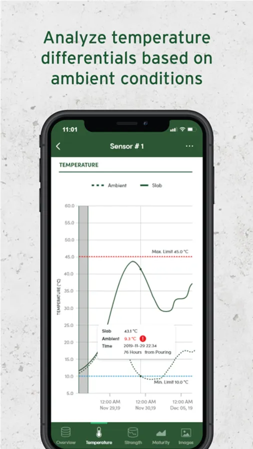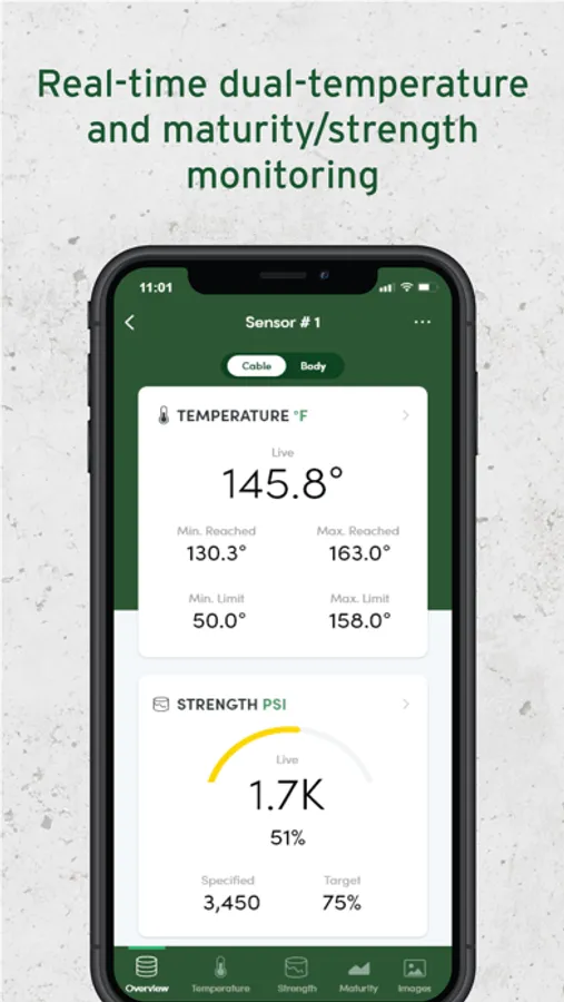 SmartRock has been equipped with dual-temperature monitoring capabilities. This enables users to measure temperature values at two locations simultaneously allowing users to easily monitor temperature differentials between the concrete’s core and surface.