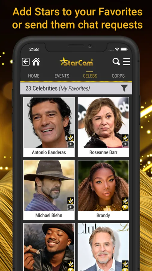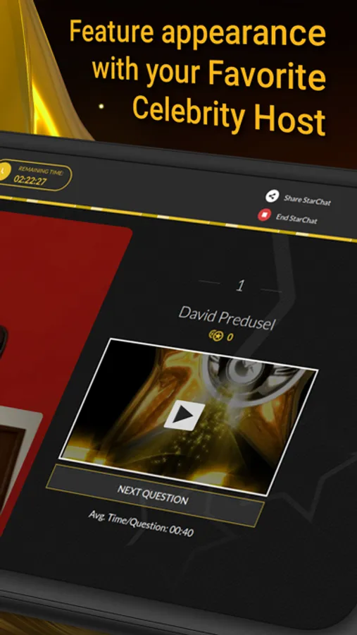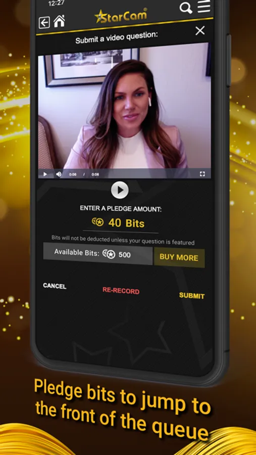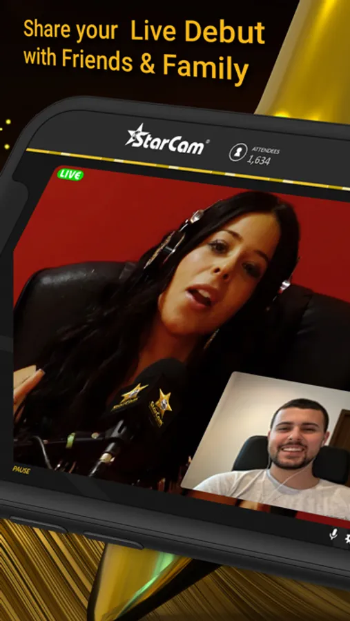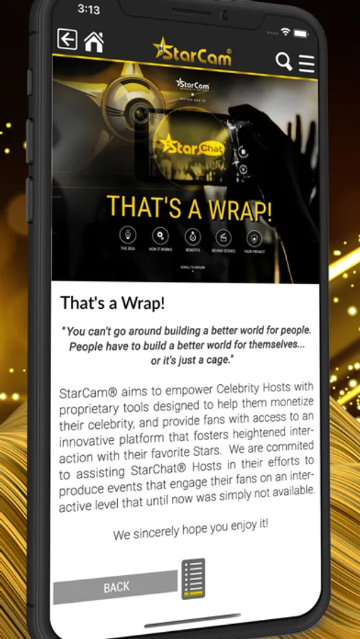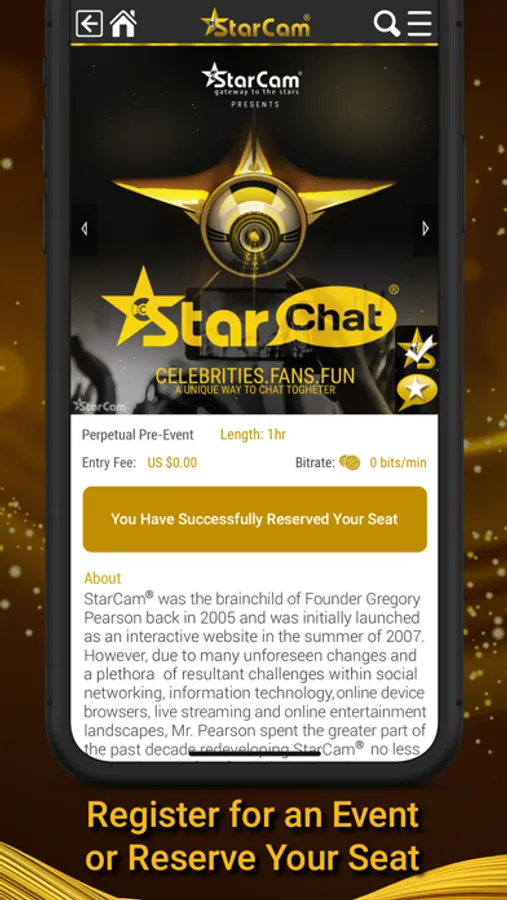 StarCam® is proud to introduce our latest App which features live StarChat® events. A StarChat® event is a Live Video Broadcast that your favorite Celebrity can host from anywhere in the world. Able to host events from almost any device, Celebrities can now produce a 'one-to-many' interactive experience SO intimate, it's like meeting them in person! Viewers record video questions which are then 'integrated' moments later into the live production. Incoming questions are loaded into our 'dynamic queue' where they are featured in the order received, but if Fans are too anxious to wait, our 'pledging' feature lets you attach 'bits' to your question and leap-frog to the front of the line! During an event, 'featured' video questions are displayed with our patented 'picture-in-picture' feature inside the live production broadcast! This and too much more to mention, is the result of over a decade of development which has led to the successful acquisition of over twenty-five U.S. Patents! We hope you will enjoy all your favorite Stars on StarCam®. We only ask that you please remember to be courteous and respectful of others while enjoying the app, but above all else... let’s all have FUN!