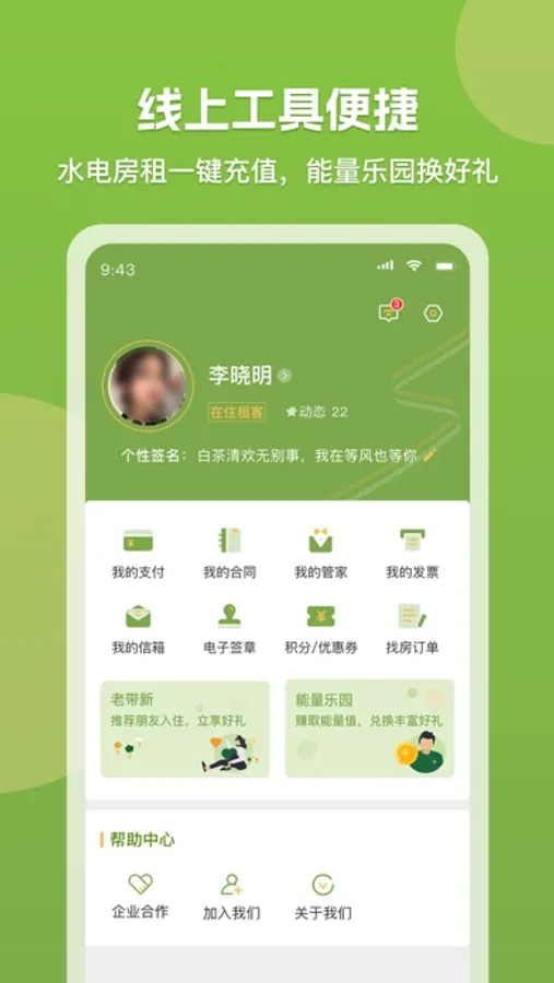 微领地APP可提供在线找房定房、在线支付报修等生活服务,帮助每一位租户享受生活的便捷和社区的温暖。
