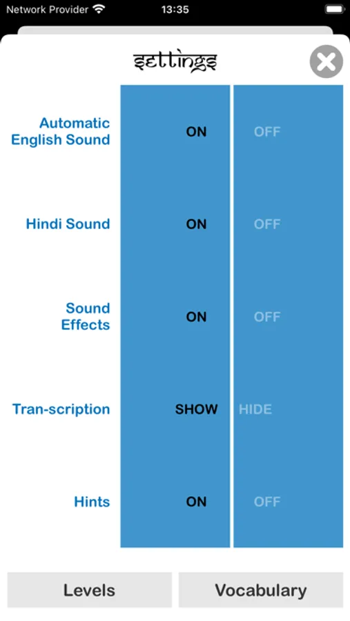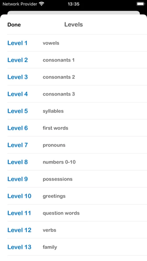 Each game level has 12 letters, words or phrases. There are 18 levels to guide you from reading vowels and consonants to first words and useful phrases.