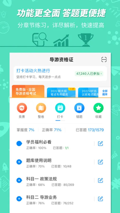 1、丰富的导游题库,最新的导游词,包含科目一(政策与法律法规)、科目二(导游业务)、科目三(全国导游基础知识)、科目四(地方导游基础知识)各个知识点,符合新版导游证考试考纲;
