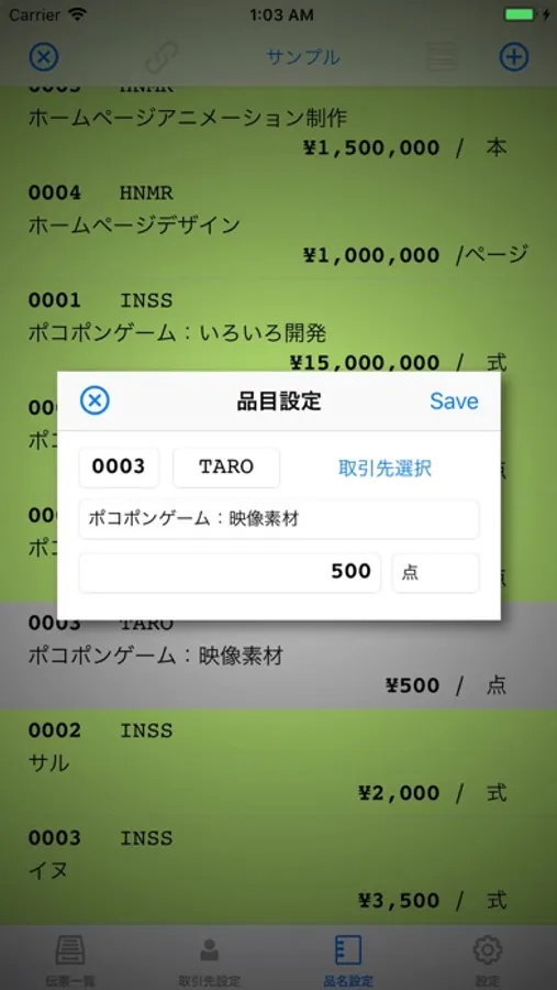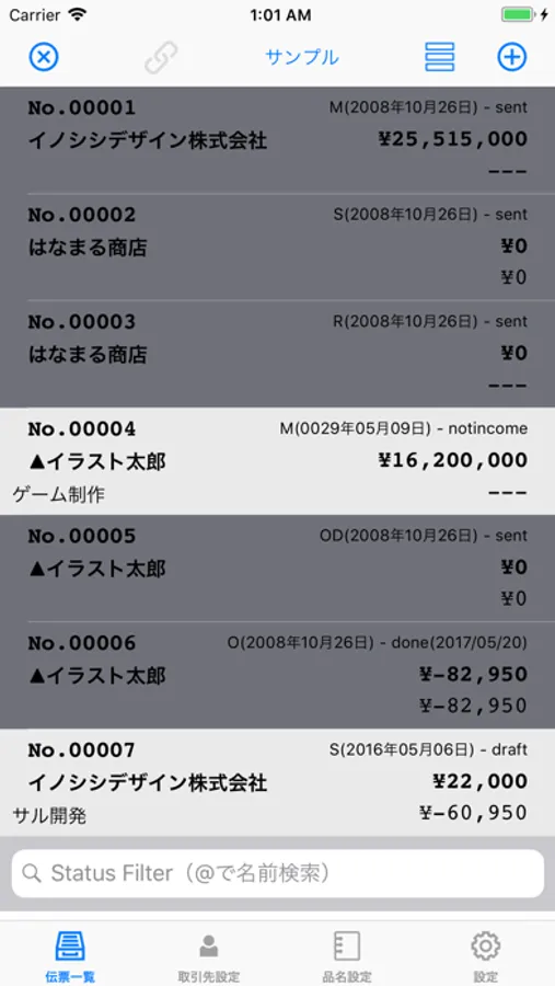 まず、取引先を作り、次にその商品を準備しておきます。その後、各種支出タイプ、収入タイプの伝票を作成していきます。伝票一覧を表示すると、その収支の合計をいつでも確認できます。
