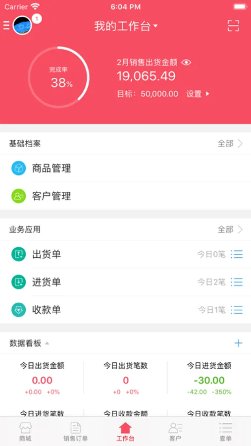 【工作台】按员工工作角色划分采购、销售、财务、仓库、管理五大功能模块,智能筛选显示功能模块、待办工作、关键数据和常用工具,让工作更轻松和高效。