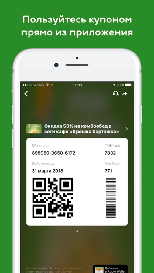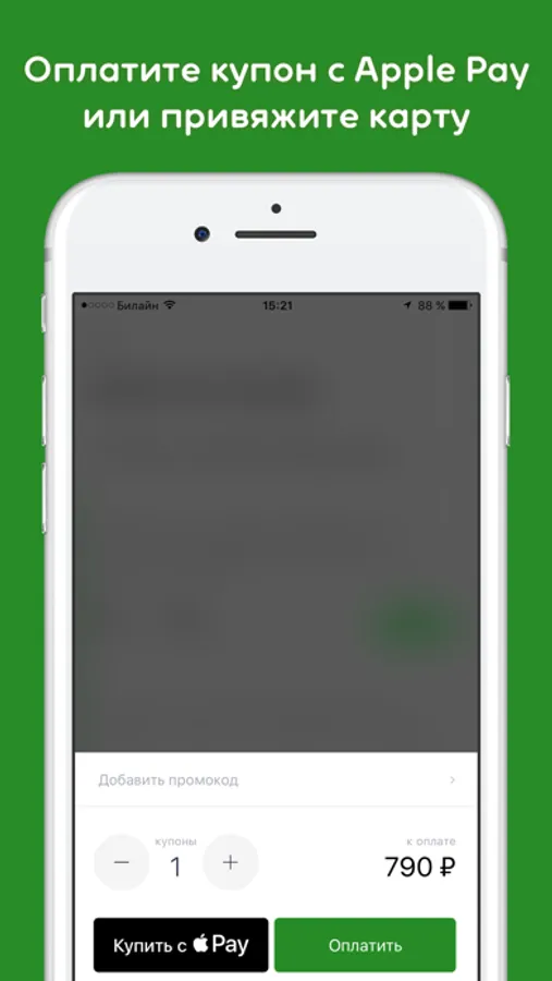 - покупать купоны и использовать их, пользуясь только мобильным телефоном;