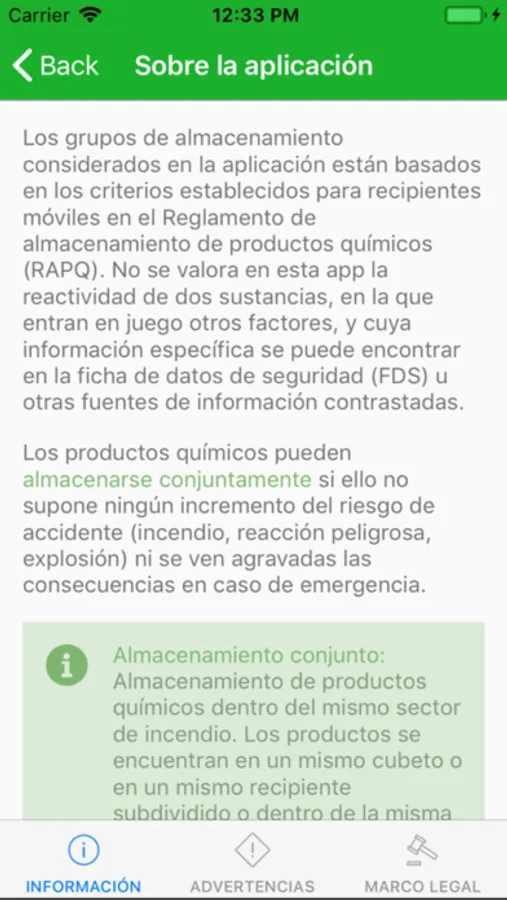 Los grupos de almacenamiento considerados en la aplicación están basados en los criterios establecidos para recipientes móviles en el Real Decreto 379/2001 Reglamento de almacenamiento de productos químicos y sus ITC de desarrollo.