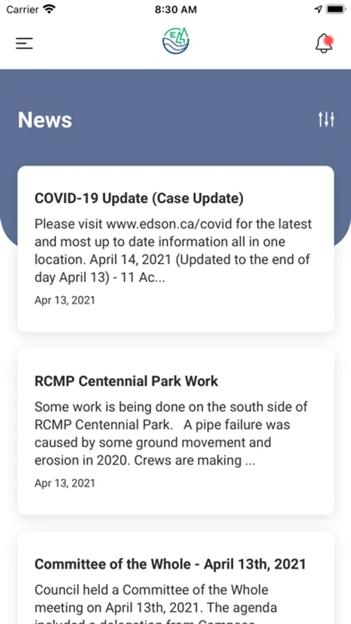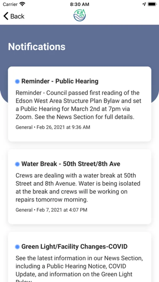 The Edson Town App provides citizens of the town of Edson with up to date news and events around town, garbage pickup reminders to notify when to put your trash out, and emergency/general notifications to alert you of important news or events that may impact your day to day routine. Using the Report a Problem feature you may also send city officials a short description and picture of the problem you encountered around town.