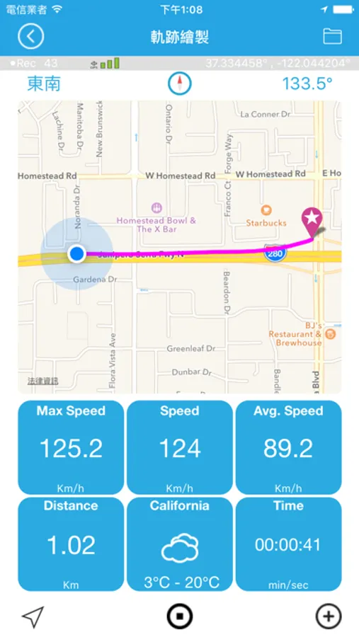 即時記錄使用者移動軌跡,並顯示行車資訊(ex:時速/里程/時間),地圖上方亦設置即時方位資訊,使用者點擊即可將地圖轉為目前方位,讓缺少方向感的您不再迷路!錄製完成後亦可儲存至資料庫並且即時分享至社群。