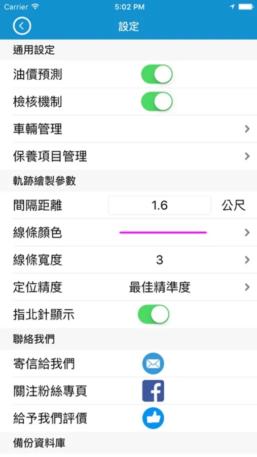 豐富且自由度高的使用者設定介面,用戶能夠自行設定軌跡繪製參數,依照喜好選擇線條寬度及顏色、主頁面關注供應商,亦可備份及還原資料庫運行在不同裝置(支援Dropbox & Google Drive)