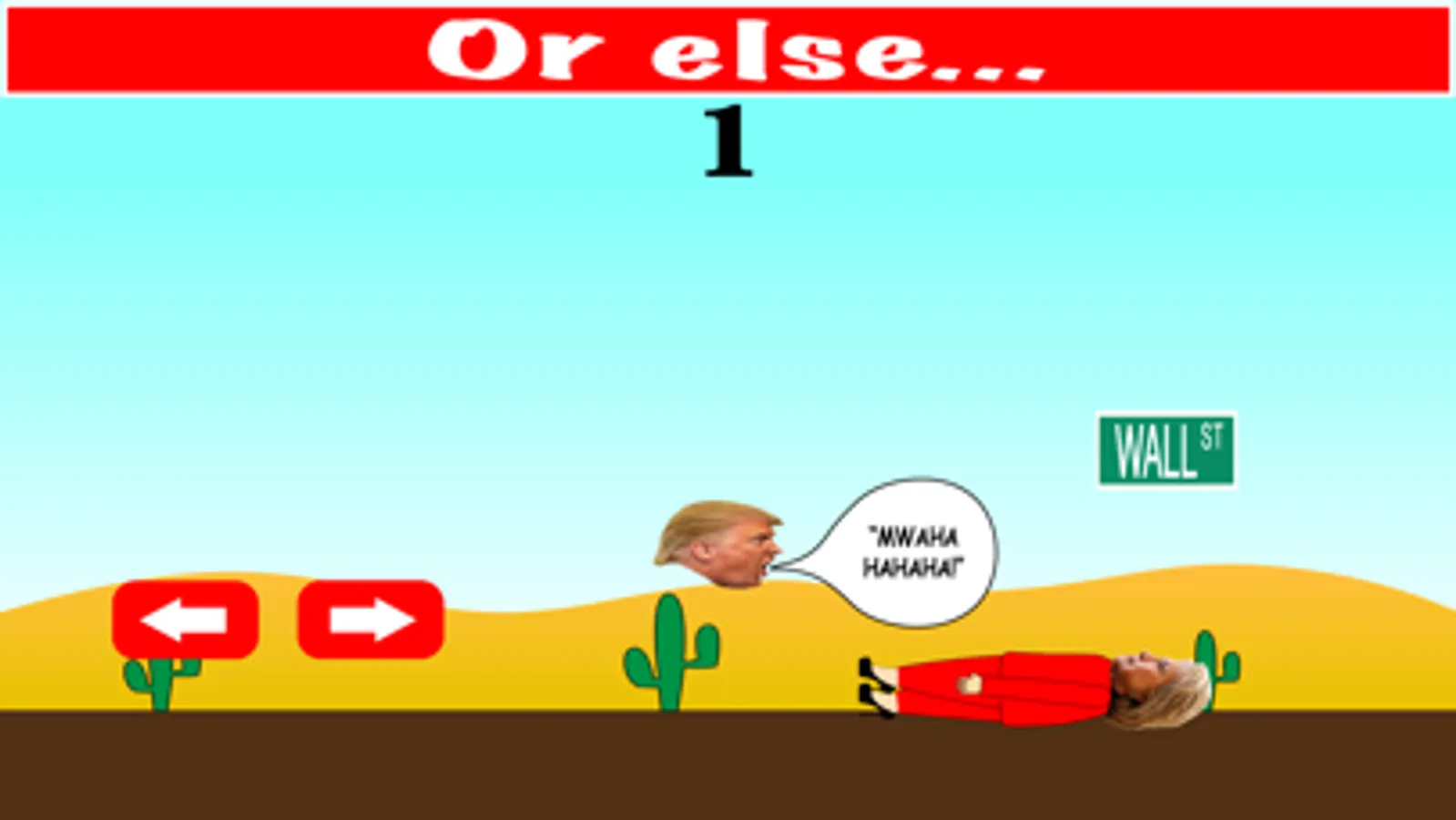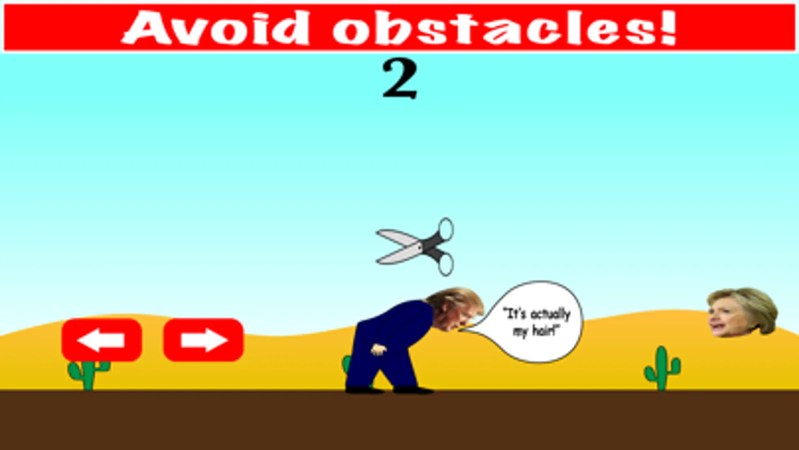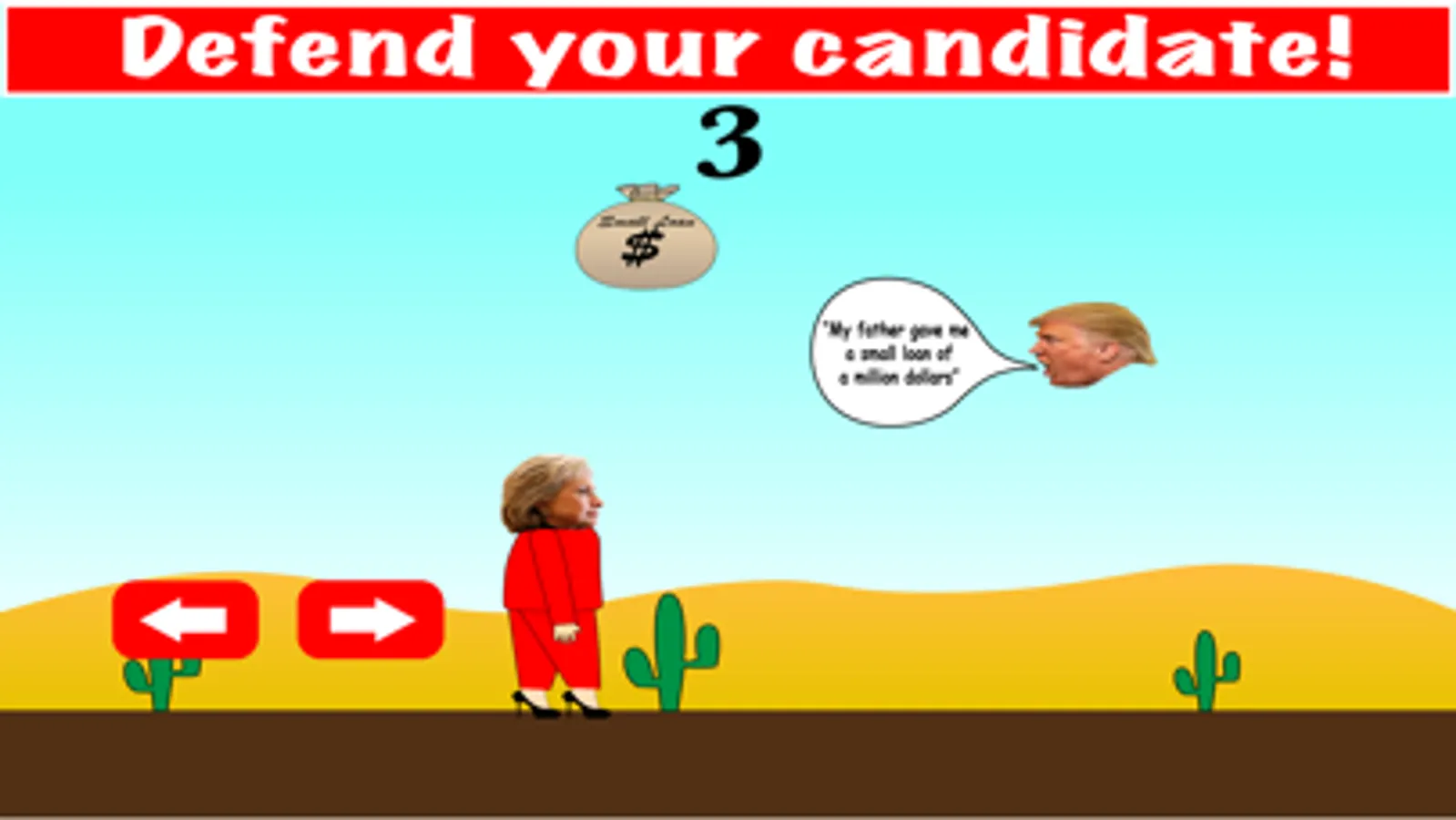 Donald Trump and Hillary Clinton are stranded in the desert and they need your help! Choose a candidate and defend him or her from the wraths of the political opponent!