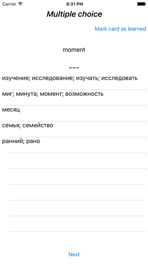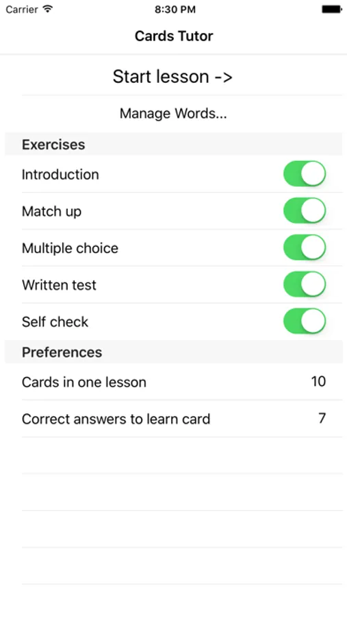 You can choose existing card lists that you want to learn, or you can create new ones yourself: either manually or by importing cards from an online CSV. This gives you incredible freedom to choose exactly what you want to learn. You can configure how many correct answers are required to mark card as learned as well as number of cards in one lesson.