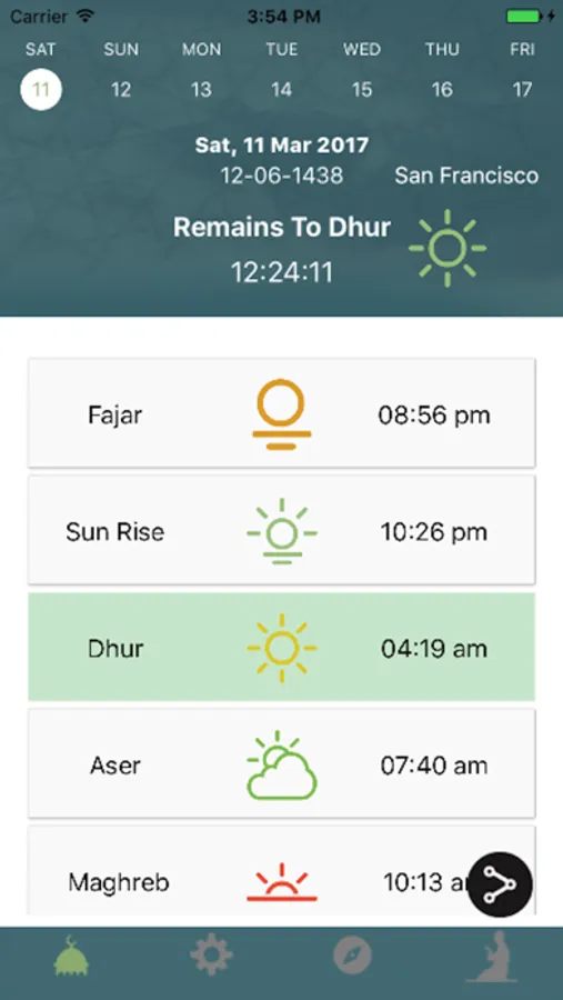 - Shows the times for the Fajr, Sunrise, Dhuhr, Asr, Maghrib et Isha.