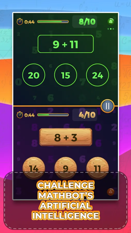 You can also solve math quizzes in "single player" or "two player" mode and challenge your family, friends or MathBot's artificial intelligence.
